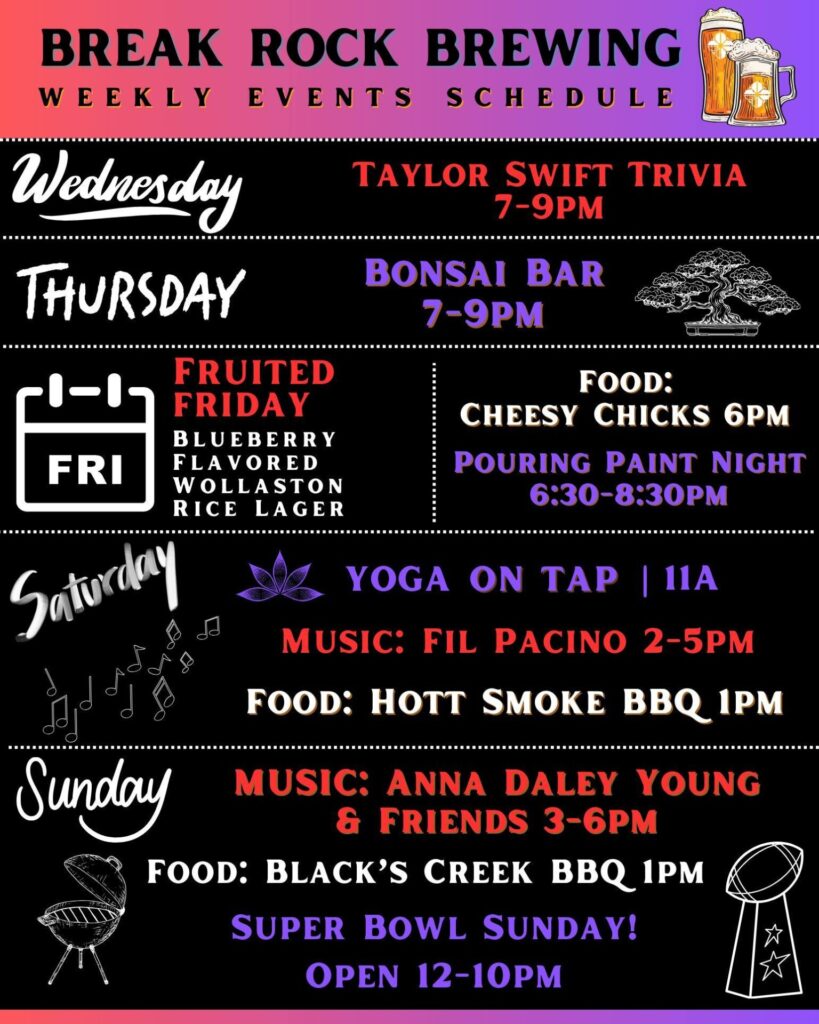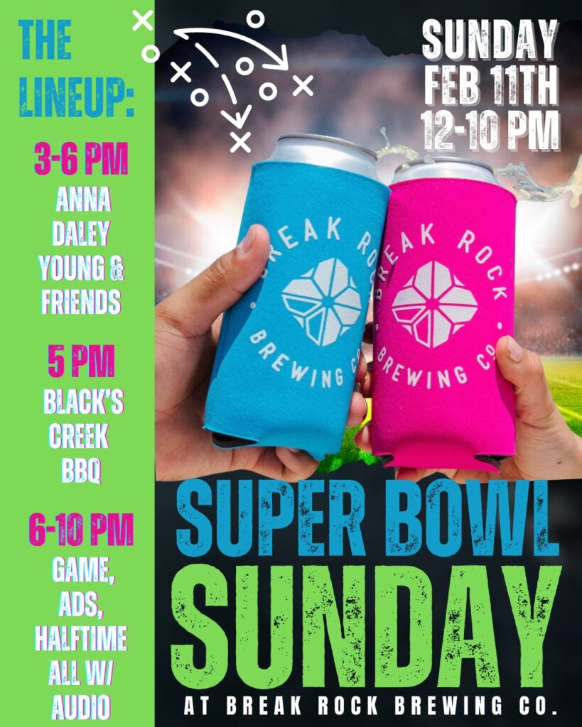 We open at 12PM and have extended our hours until 10pm for the game! We’ll have a full band from 3-6PM fronted by New England Grammy Nominee @annadaleyyoung ! @blackscreekbbq will be popping up at 5PM and slinging some great BBQ! We will carry the game, commercials, and halftime show – all with house audio! We’ll also have opportunities to enter to win some great prizes at the bar by picking the winning team and voting for your favorite commercial! Football, beers, BBQ, and music…the perfect play call for Super Bowl Sunday!