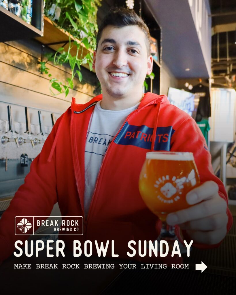 We all we got. We all we need. And on Sunday… we got the game. Make Break Rock Brewing your living room for Super Bowl Sunday, Feb 8. Kickoff at 6:30 PM, free wings while they last, and zero judgment if you yell at the TV. Bring your favorite game time snacks, grab a beer at the bar, and settle in as the Pats take on the Seahawks — on 8 TVs with full audio. This is your couch, just with better beer. Giveaways: • $25 gift card for the most spirited Pats fan • $25 gift card for the best-dressed pup Super Sunday Funday Schedule: • 11:00 AM – WAGS of the NFL Sculpt Class (ticketed, pre-reg required) • 12:00 PM – Open to the public • 1:00–6:00 PM – Sandwich Boy food pop-up • 3:00–6:00 PM – Free live music • 6:00 PM – Pregame on eight taproom TVs with audio • 6:30 PM – Super Bowl LIVE with audio + FREE WINGS (while they last) • 10:30 PM/End of Game – Close Living room rules apply. No reservations accepted. But, if you would like to reserve our gameroom (50 person capacity) for the game, email [email protected]. Let’s go PATS! #pats #weallwegot #weallweneed #drakedrakemayemaye #superbowl
