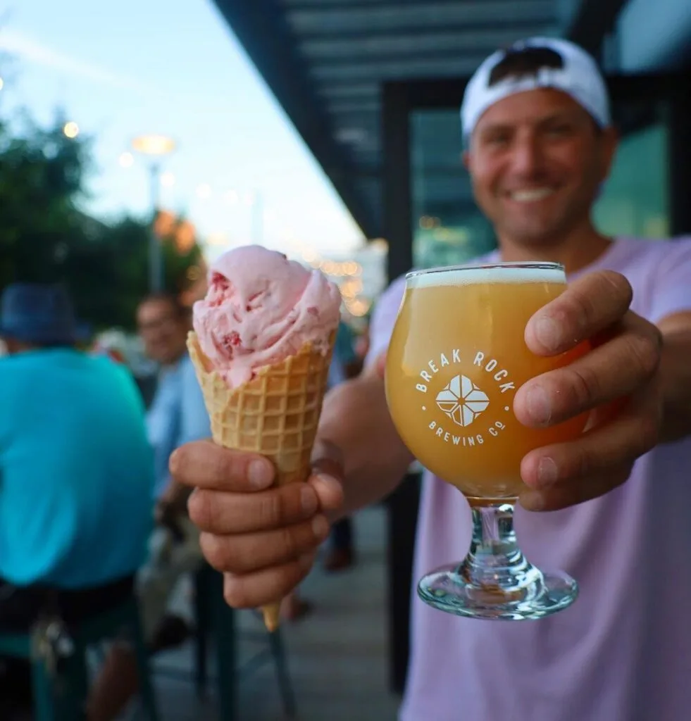 Friday ~ treat yourself 🍦 ! Hot summer weather calls for cold treats…have you tried @donatos.gelato yet?! Ice cream, frozen yogurt, gelato, pastries, coffee & more 😋 right next door to us in the marina. Rich paired strawberry in a waffle cone with our Changing 500 NEIPA 🍓🤝