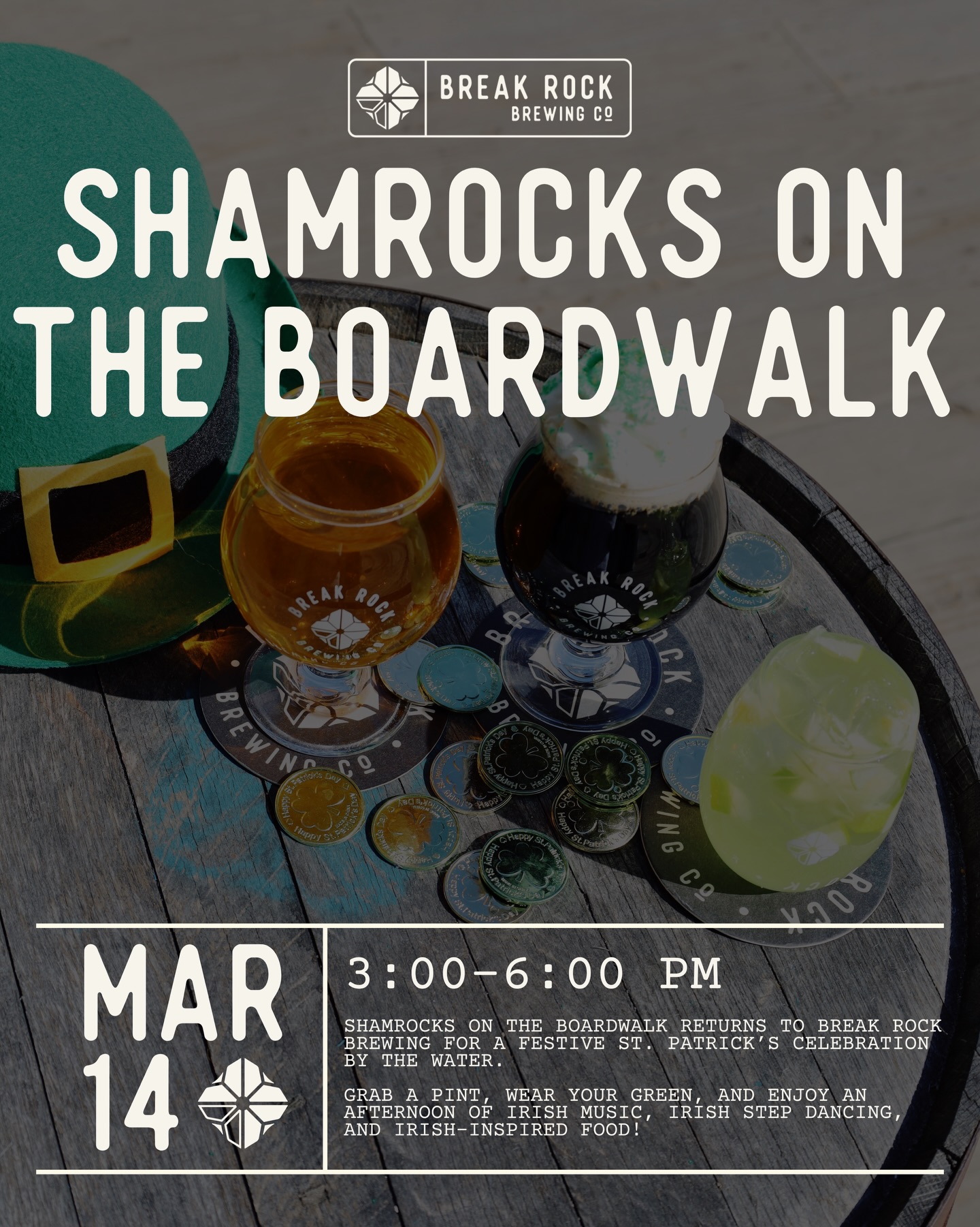 March is stacked at Break Rock Brewing from creative workshops, live music, to community meetups, and festive seaside celebrations Shamrocks on the Boardwalk returns Saturday 3/14 with a live Irish set from @thekiddins, @brady_academy step dancers, and an Irish-inspired food pop-up from @sandwichboycompany! ☘️ @quincywomenwalking is back Saturday 3/21 to get you out for fresh air, movement, and meet great local women! Full event details at breakrockbrewing.com/events.
