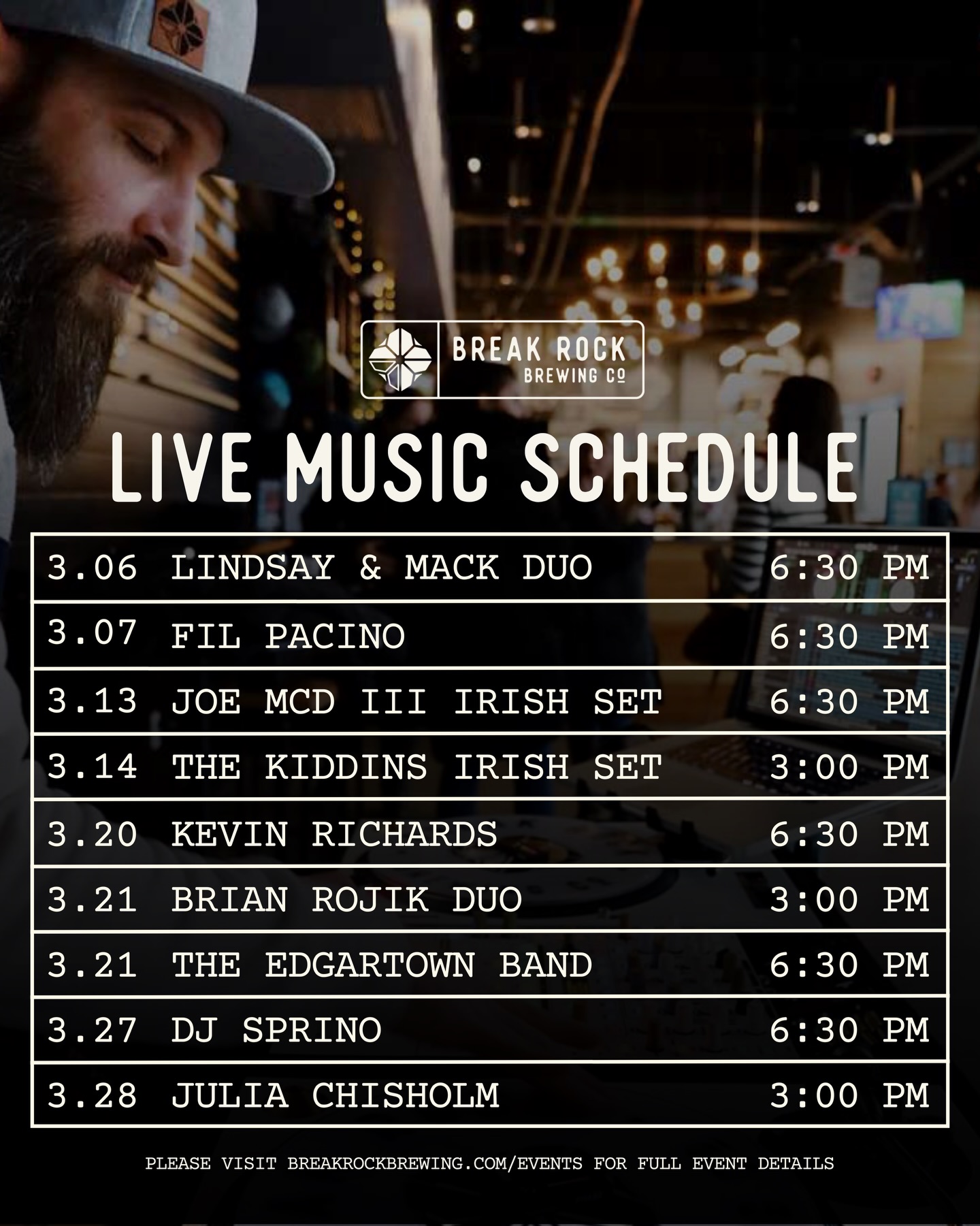 March is stacked at Break Rock Brewing from creative workshops, live music, to community meetups, and festive seaside celebrations