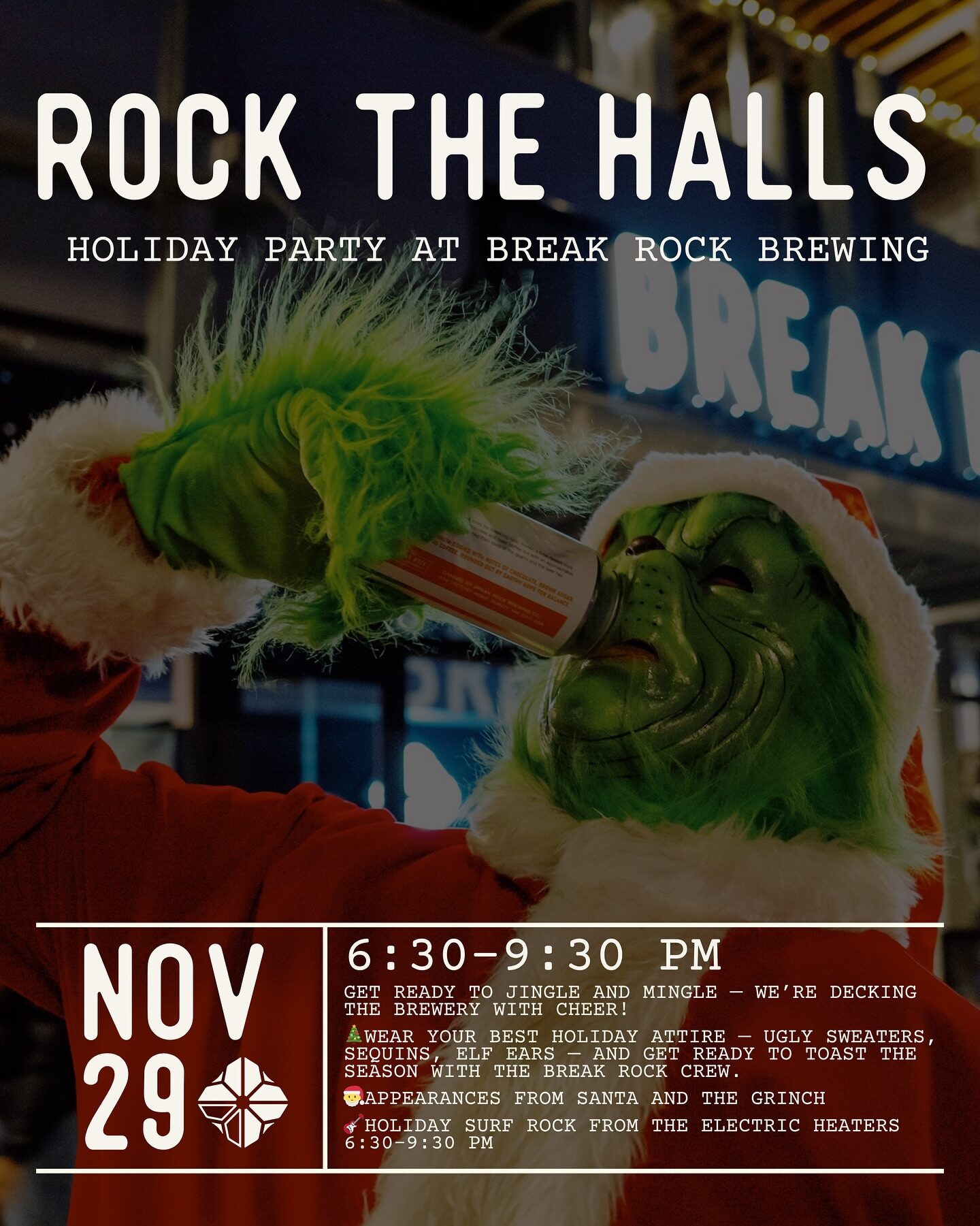 November’s rolling in with colder weather, but we’re not slowing down one bit. From cozy creative workshops where you can DIY gifts for your loved ones, to our dog adoption event & fundraiser with @rufftalesrescue, and our festive Rock The Halls holiday party featuring holiday surf rock, Santa, the Grinch, and hot cocoa seltzer — we’ve got something for everyone. Planning a holiday party? We’re now booking private events for family gatherings, corporate celebrations, and more. With low beverage minimums and flexible options, it’s the perfect spot to toast the season. Head to our website and fill out the Private Parties request form to get started! Bundle up, get out of the house, and meet us on the boardwalk for a month full of good vibes, great beer, and even better company. #breakrockbrewing #bostonma #quincyma #bostonbeer #bostonevents #holiday #holidayboston #bostonholidayevents #bostonrestaurants #holidaypartyboston